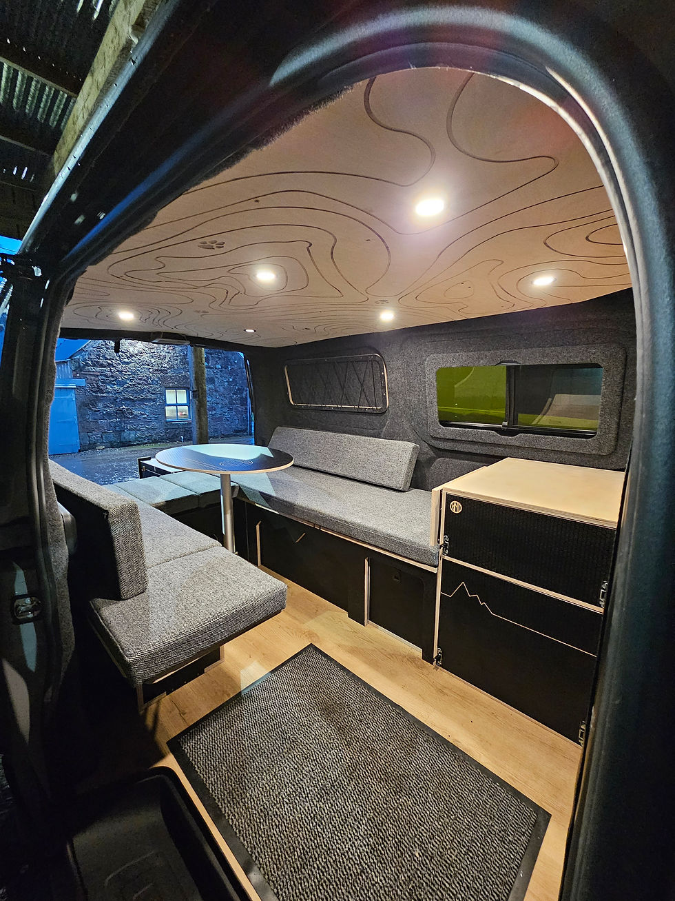 TORRIDON or SCHIEHALLION sliding bed, bed length180cm, CLACHAN or SORCHA stowage unit, BRUICH OUTDOOR or BRUICH BEAG kitchen pod installed behind the driver's seat.